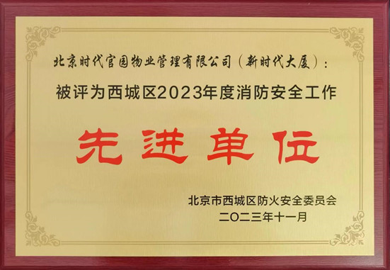 近日,新时代集团所属官园物业公司被北京市西城区防火安全委员会年授予“西城区2023年度消防安全工作先进单位”荣誉称号,这是我司连续第四次被授予该称号。