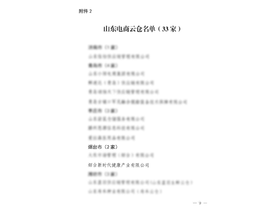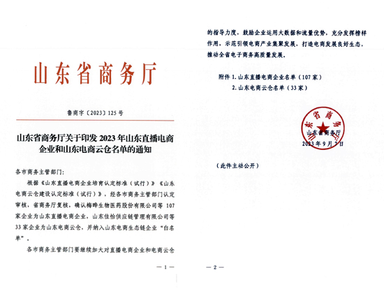 根据《山东直播电商企业培育认定标准(试行)》《山东电商云仓建设认定标准(试行)》,经各市商务主管部门认定审核,省商务厅复核,确认烟台新时代健康产业有限公司(简称烟台健康公司)等33家企业为“2023年山东电商云仓”,同时纳入山东电商生态链企业“白名单”。