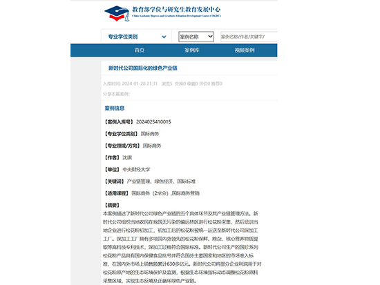 1月28日,以健康产业公司绿色产业链为研究对象的论文《新时代公司国际化的绿色产业链》入选教育部学位与研究生教育发展中心案例库。