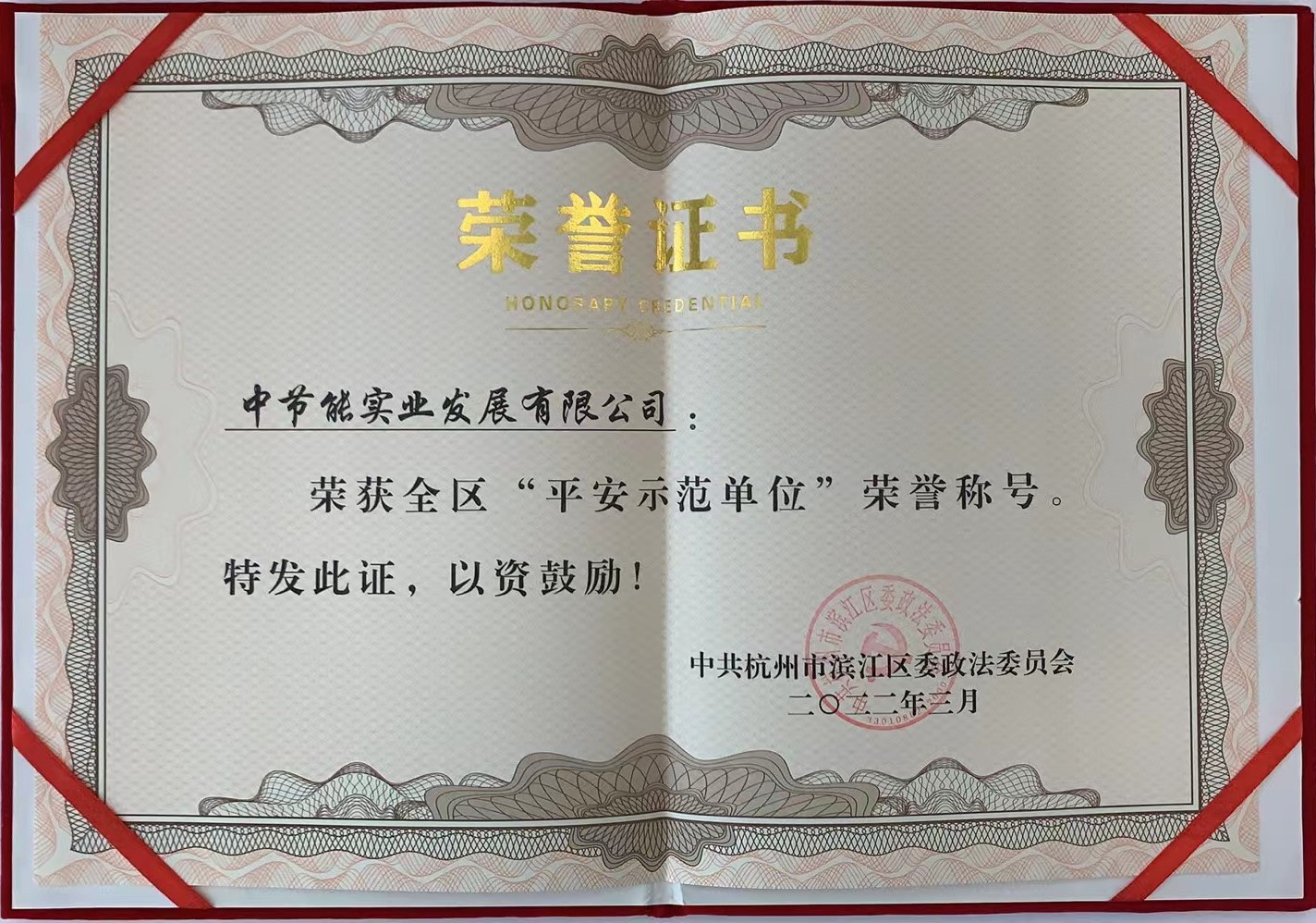 近日,在杭州市高新区(滨江)召开的“平安”专项工作会议上,中节能实业公司获评杭州市滨江区平安建设示范单位。