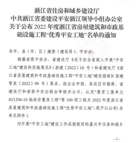 近期,浙江省住房和城乡建设厅公布2022年度省房屋建筑和市政基础设施工程“优秀平安工地”名单,中节能实业公司太湖首座项目荣获2022年度省“优秀平安工地”。
