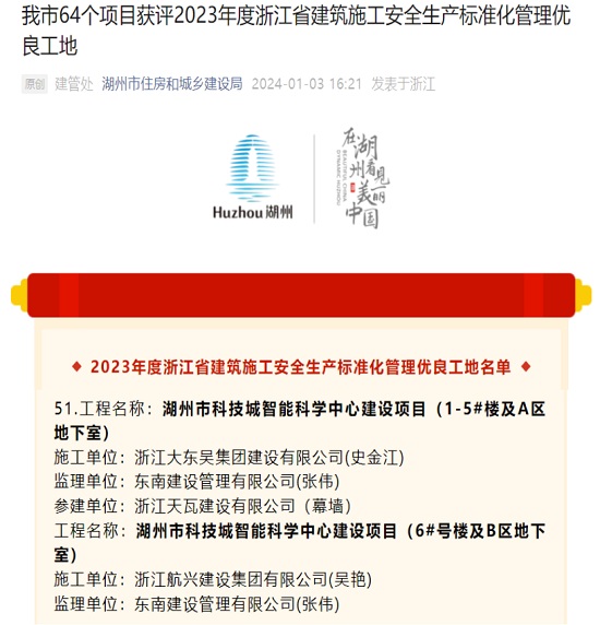 1月3日,浙江省建设厅发布《关于公布2023年度浙江省建筑施工安全生产标准化管理优良工地考评结果的通知》,位于湖州南太湖新区西凤漾单元XSS-03-02-04C号地块、西凤漾单元XSS-03-02-04C-1号地块的湖州市科技城智能科学中心建设项目(中国节能·太湖首座)荣获“2023年度浙江省建筑施工安全生产标准化管理优良工地”称号,这一荣誉是对项目在安全生产标准管理方面的肯定和认可。