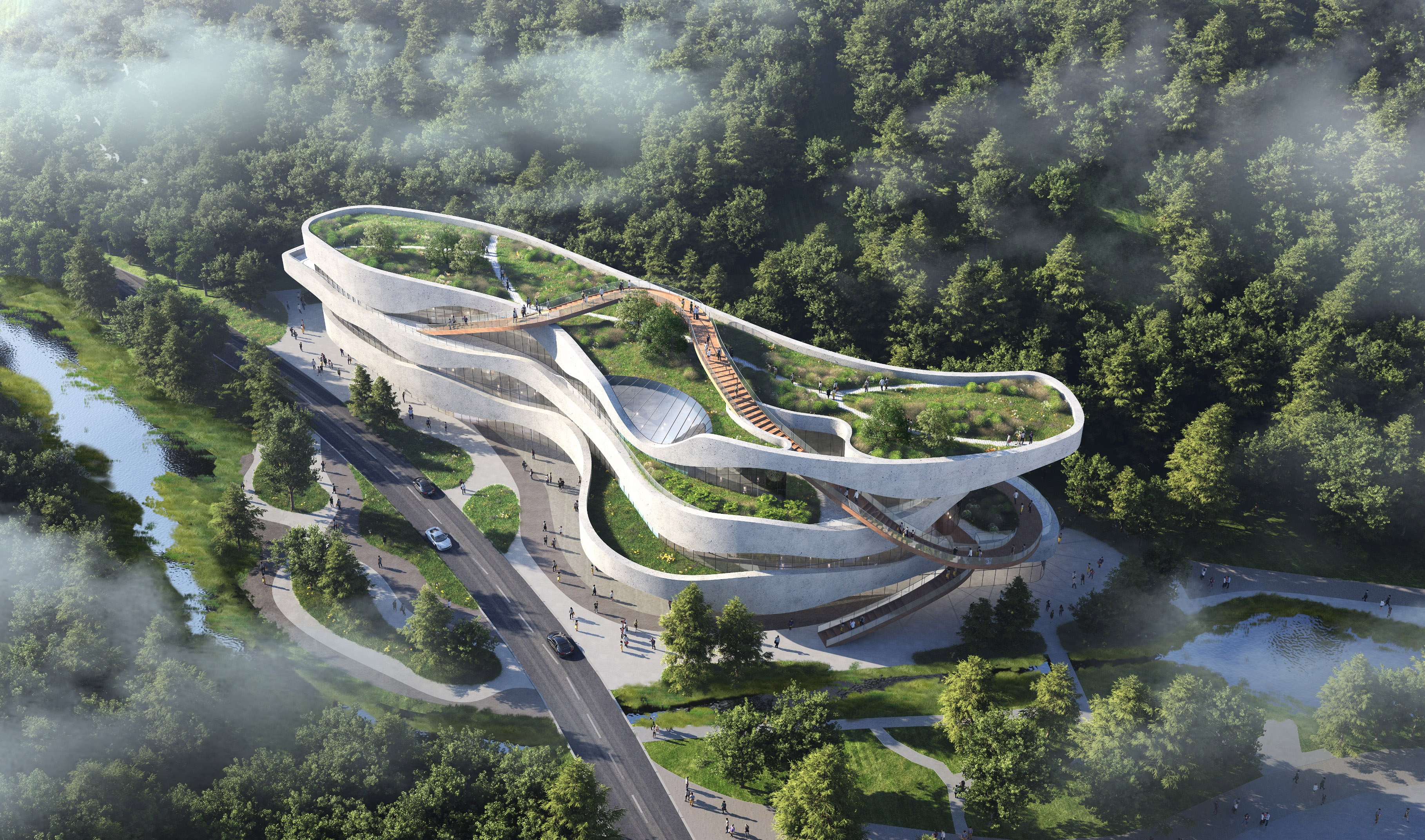 中国启源设计方案以绿色低碳、环保节能为理念,旨在打造一个绿色和谐、人与自然友好互动的场所。设计中,将建筑与基地环境相协调,使建筑形体如云层般自由舒展,好像在基地中生长出来一般,创造了灵活多变的展览空间,为博物馆未来展陈和运营管理提出了新思路。