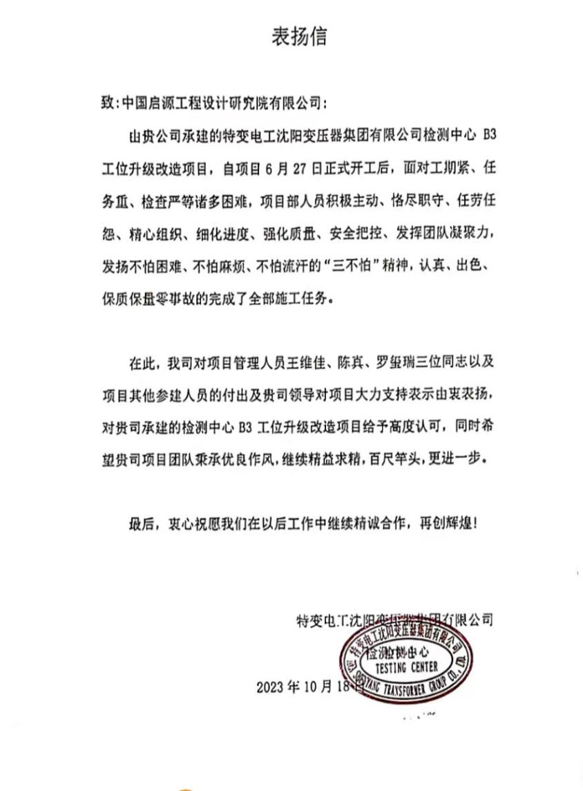 近日,中国启源所属启源设计负责的特变电工沈阳变压器集团有限公司检测中心B3工位升级改造EPC总承包项目通过竣工验收,并收到了沈变公司发来的表扬信。