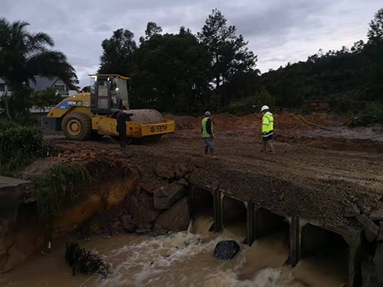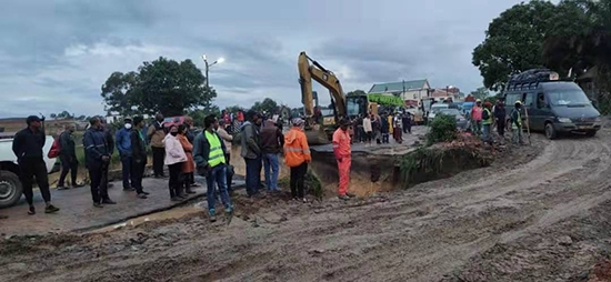 1月24日一早,项目经理带领5位中方技术骨干、20余名当地员工,冒雨赶赴道路坍塌地点,在时下时停的大雨中开展施工作业。1月25日凌晨5点多,经过日夜不间断抢修,用时不到24小时完成便道铺设工作,该路段临时恢复通行。