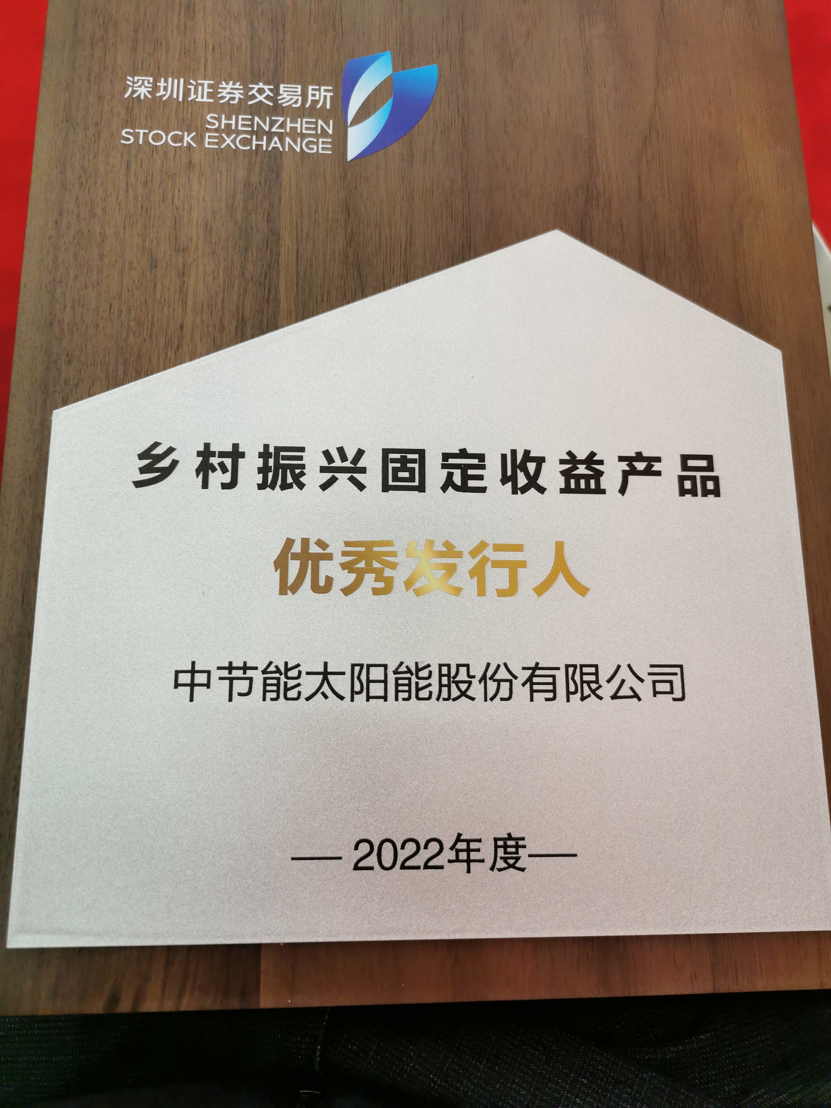 近日,中节能太阳能股份有限公司(简称“太阳能公司”)在深圳证券交易所(简称“深交所”)2022年度债券优秀参与机构和企业评选中,获得“乡村振兴固定收益产品优秀发行人”称号。