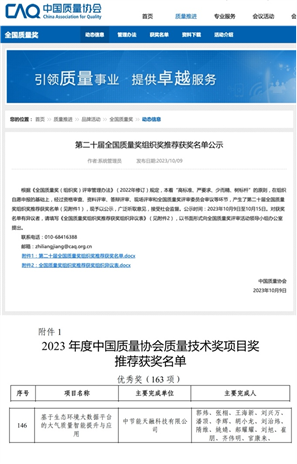 近日,中节能大数据有限公司下属中节能天融科技有限公司(以下简称天融科技公司)申报的科技项目“基于生态环境大数据平台的大气质量智能提升与应用”从全国各行业1090个项目中脱颖而出,成功进入中国质量协会2023年度质量技术奖获奖名单,荣获质量技术奖项目奖优秀奖。