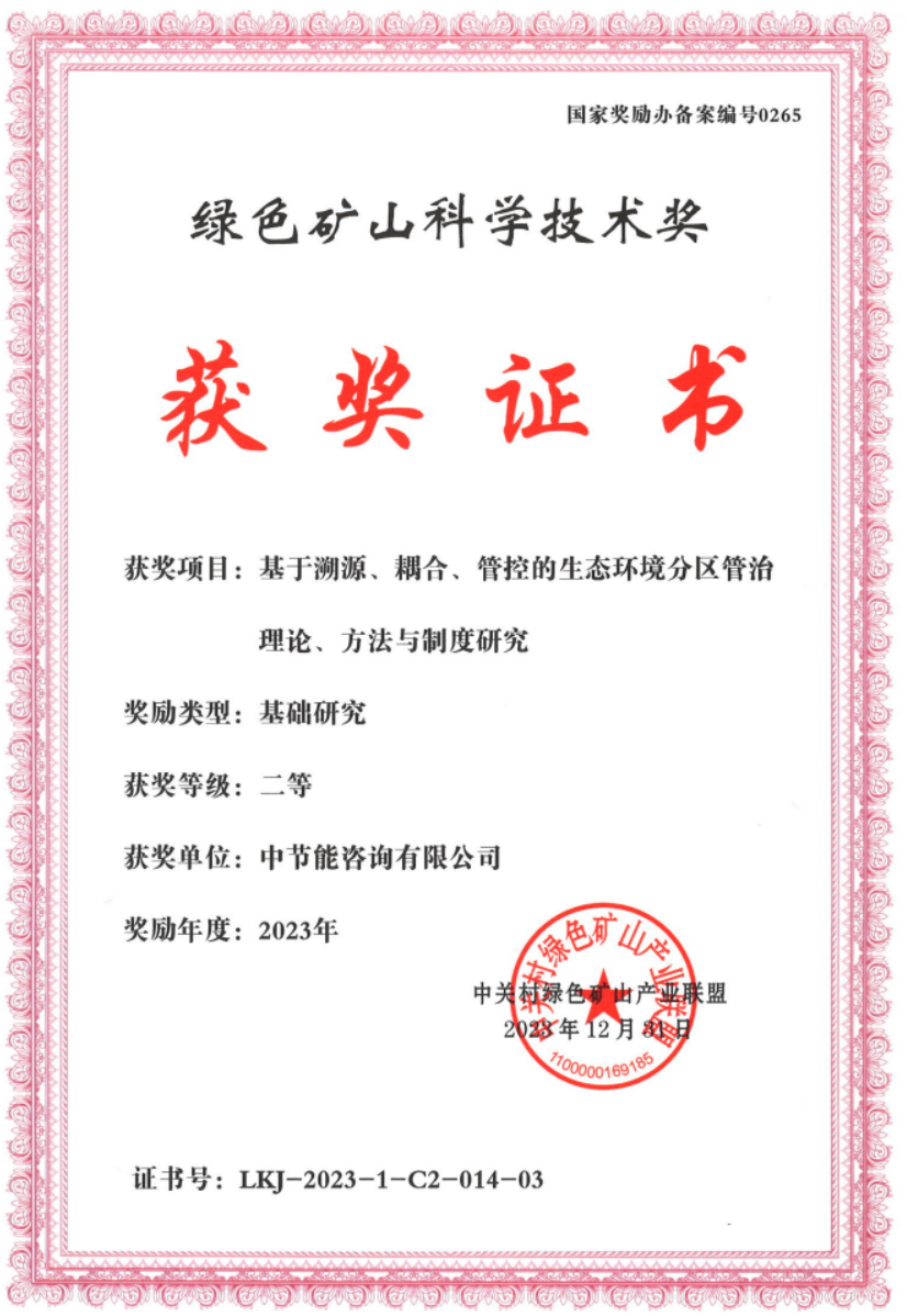 中节能咨询在生态环境分区研究领域十年耕耘,参与出版了《国土空间生态环境分区管治制度研究》(2023)《国土空间生态环境分区管治理论与技术方法研究》(2019)《“多规合一”试点实践和理论创新》(2020)《中国生态环境分区管治制度的演进与发展》(待出版)4部专著。相关研究成果荣获2019年度优秀城市规划设计奖三等奖,2019年度北京市优秀城乡规划奖二等奖,2018年度环境保护科学技术奖二等奖,此次再次获得2023年度绿色矿山科学技术奖基础研究类二等奖,既是对十年研究坚持的肯定,又是对前路的指引。